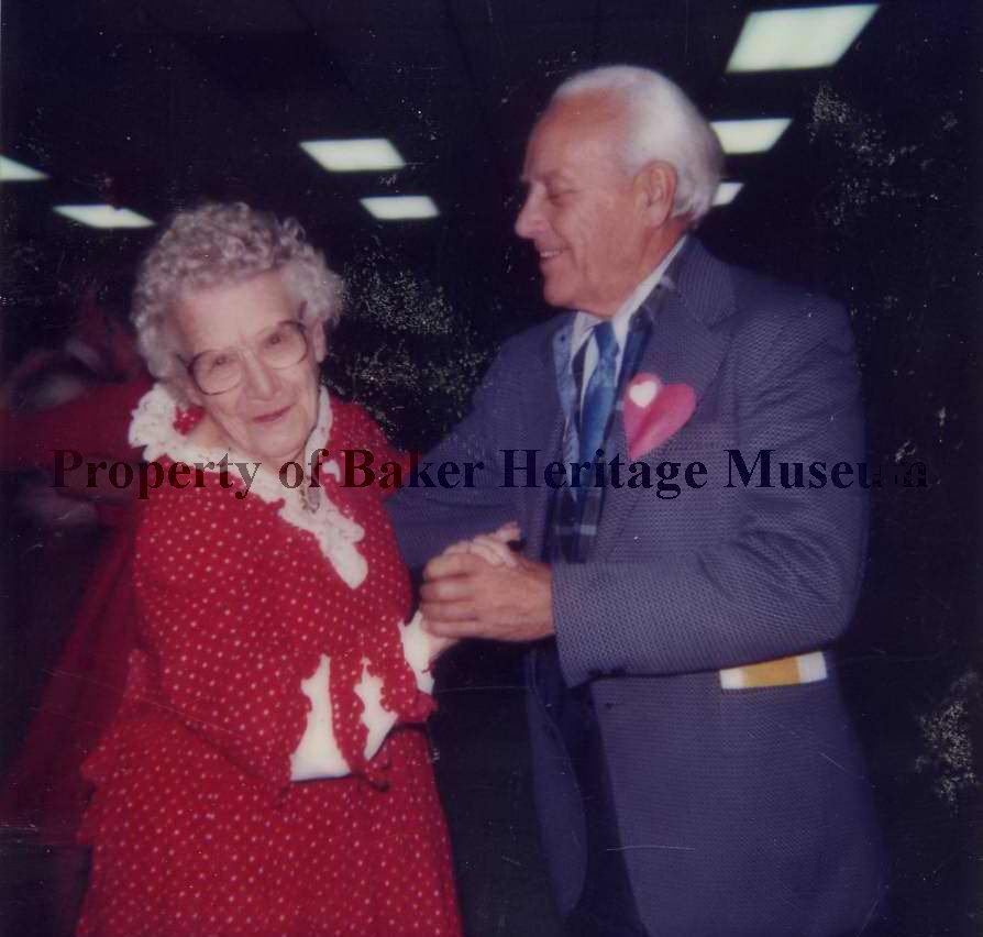 Picture of Ethel Damport Love. Taken on Feb. 14, 1985. Ethel and Man dancing. Ethel is in a red pocadot dress, man is in a blue suit with a heart on his collar
