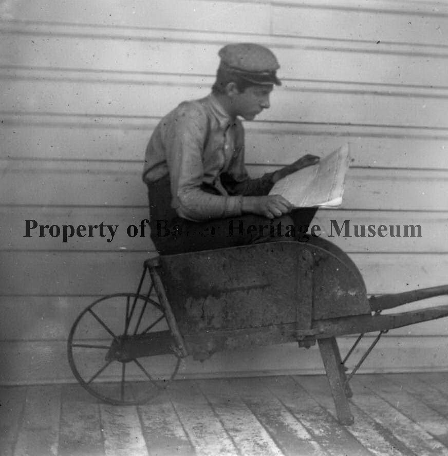 Two pictures, one of a man in a wheel barrow and the secon of a man siting on a stump.
