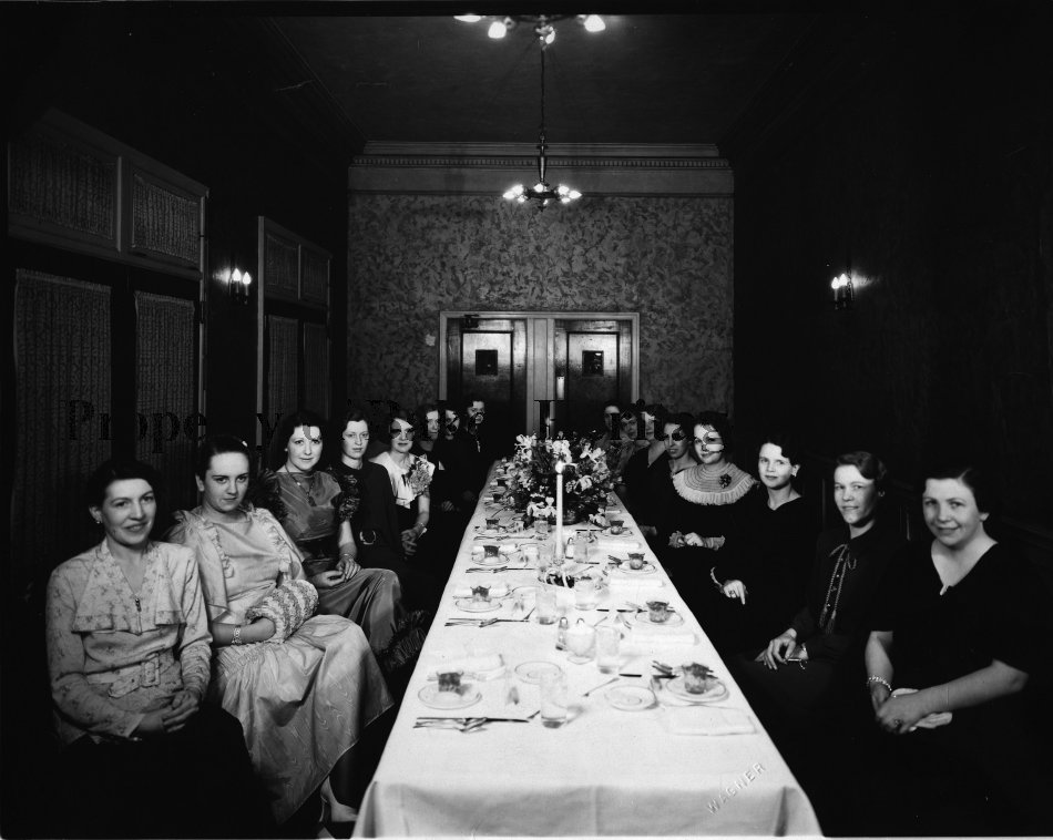 Esther Hill's farewell dinner given by Leo Adler in the Baker Hotel, prior to her wedding in 1942. (Esther is 1st one on left).Note: These are Leo Adler's employees. Photo donated by Esther's daughter.