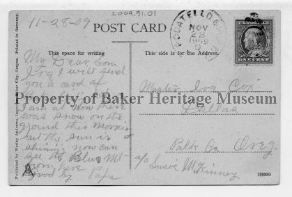 Postcard, "Market Day Scene, Baker City, Oregon." Main St. scene in front of Heilner Bldg, depicting crowd gathered for horse sale. Postmark Pocatello, Idaho Nov. 28, 1909. Addressed from "Papa" to Master Ira Cox, Dallas, Polk Co. Oregon. One cent stamp has been cancelled.