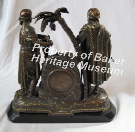 Bronze clock with three—dimensional statuettes of a man and woman on either side of the clock. May be a depiction of Jesus and the Woman at the Well. The statuettes are in classical poses in a middle eastern setting with palm tree, lilies etc. The clock face is white metal hand painted and reads: Seth Thomas Sons & Co. N.Y. . The gold metal holds glass protective front and face in cast bronze. Back flap is in good condition and clock appears to work with a pleasant chime. The works # are 40341 ST & Steth Thomas New York. The clock and statuettes are on a black stone base.