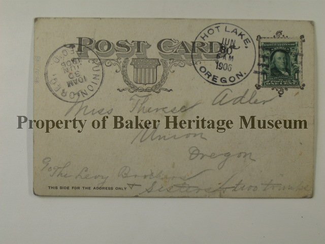 Theater cartoon postcard of a man (looks like an ape) in a theater uniform standing on a stage with a broom in front of a curtain. The colors are yellow and black and reads: "I have the center of the stage". The back of the postcard in black ink reads: "Postcard, with a 1 cent Benjamin Franklin Stamp (series 1902) United States, America 1706, Franklin. The Post Office stamp: Hotlake Jun 30th, 6am 1906, Oregon" the other, "Union Oregon, June 30th, 10am 1906, Rec." The correspondence is to Theresa Adler in pencil both on the front and back.