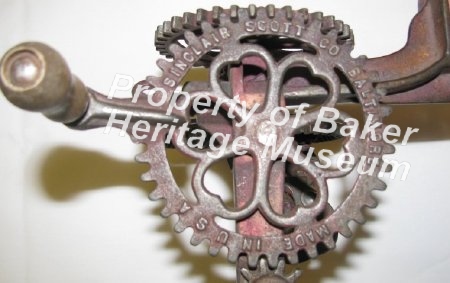 Apple Peeler, "Sinclair Scott CO, Baltimore, Made in USA"; Iron, 6 gears various sizes, table clamp, wooden handle, 3 prong core holder. Appears to have been red in color at one time. Used by Norman Hansen's parents on their ranch at McEwen.