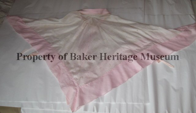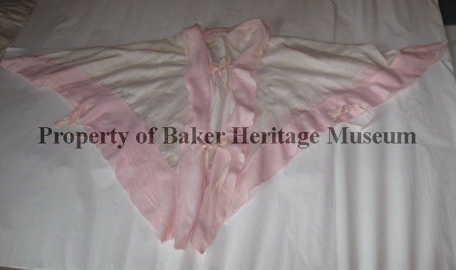 Bed jacket; lightweight cotton; cream background with small green and pink cloud—shaped design, small green dots and dashes; 3.25" solid pind band around perimeter of garment; eight pink silk ribbons .5" wide x 11" long function to tie jacket closed in front and under arms.