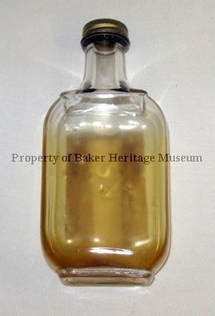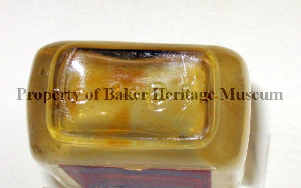 Clear glass with tin scew—on lid. Paper label is orange and black. Bottle maker's mark is on bottom of bottle: "14" with upright oval with horizontal diamond across the oval.