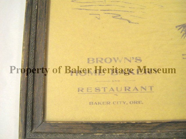 Stained wood framed advertisement for "Brown's Home Bakery & Restaurant, Baker City, Ore."