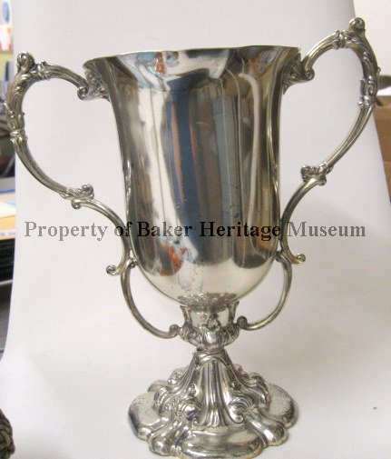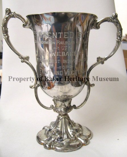 Silver plate trophy, fluted base, two handles. Text on front: "Presented by the Oregon—Washington Railroad Navigation Co. to W. E. Baker for the best individual display of fruit and vegetables, Baker County Fair, 1912." Interior is gilt covered.