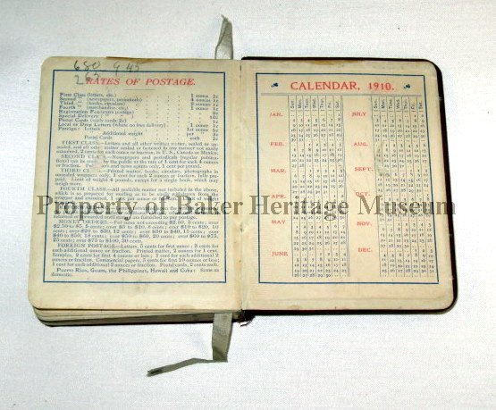 One year diary (1909) of "sister Anna" dedicated to "mother Alberta and the babies." Book covered with maroon moire fabric over cardboard (?). Front cover embossed with "Lest we forget." Unlined pages. Edges of pages are gilded. Diary entries are in black or blue ink or in pencil. Date at top of each page in blue printing. Loose ivory, satin ribbon marker that originally was attached to binding. Diary has info. on crops, livestock, personal activities and reflections, tables & quantities of water discharged over weirs. No locale or geographic information obvious. Wedding & birth info,1843—1938, in back of diary. Clipping from newspaper or a book on gestation table pasted to last page of book. Back flyleaf is 1910 calendar, front flyleaf=1909 calendar. Back side of back page has postage rates.