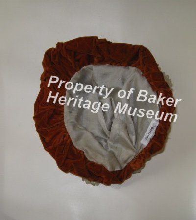 Hat; dark gold velvet with 2" wide lace trim; decorative metal piece 1"wide x 3.25" long sewn to one side; silk ecru lining; metal piece compriced of 4 open ovals within an open rectangle.
