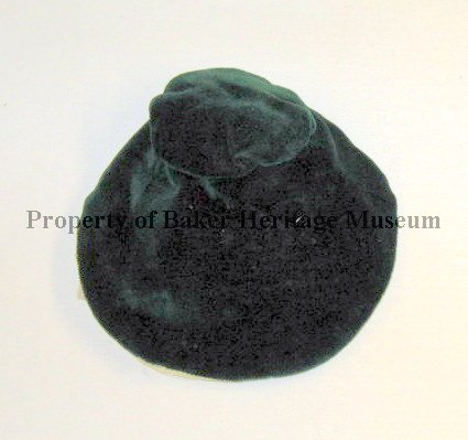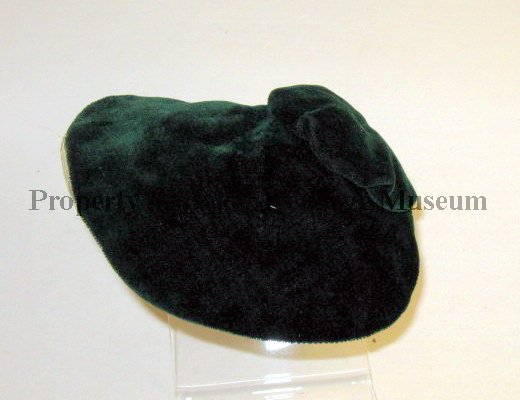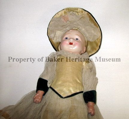 Has fabric body; legs and arms are fabric; hands, head, and boots are composition. Wearing a yellow dress trimmed with green velvet cuffs, green satin binding around waist. Hem is trimmed in gold. Gold bloomers. Ruffled neckline. Features are painted: blue eyes, brown boots. Jointed arms and legs. Back of right calf bears letters CR underlined and numbers 754 under the line. Hair is molded and painted light brown. Has hat: green velvet lined with yellow satin and yellow net ruffle with pink rosebud under brim. Hat is not attached to head.
