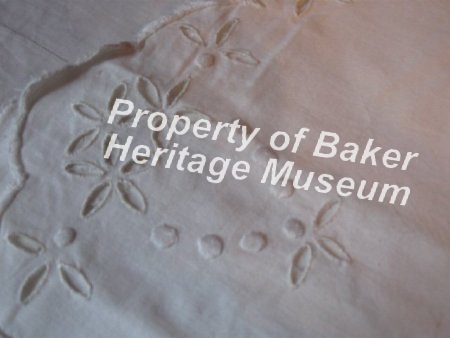 White Cotton Sheet, with one scalloped edge with an open lace work inside scalloped, embroidered dots with a flower motif. The other edge is a double seam with open lace work connecting edge to sheet.