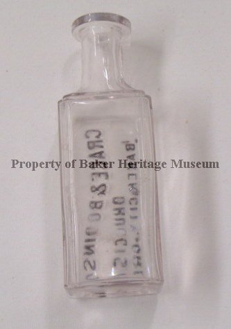 Clear glass upright rectangular bottle with raised molded lettering on front reads: Grace & Bodinson Druggists Baker City, Ore. On front just below neck is air bubble in glass. Bottom reads: "WTCo USA"