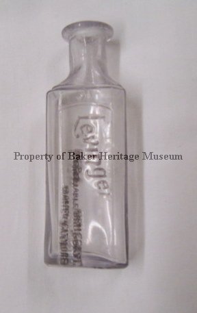 Bottle, clear glass with rectangular body and clear neck. Missing stopper. Front of bottle reads "Levinger, the reliable druggist, Baker City, ORE." On front just below neck number "31". Bottom has diamond shape with unreadable number or letter inside diamond.