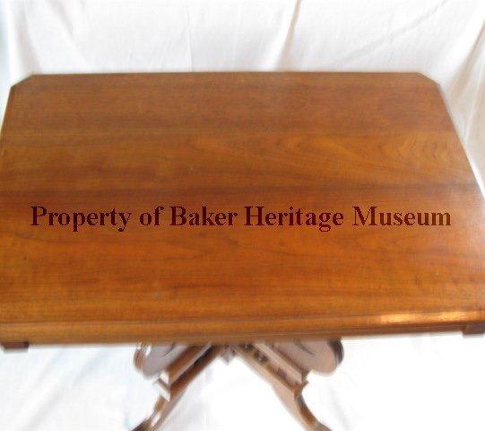 Four legged rectangular card table with open framework, railings with cones at ends and circular beads on top. The legs of the table cross at an X—shaped intersection toward the edges of the table's top. Feet come out from the table base and end in small casters. Looks like staned oak.