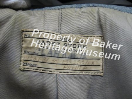 Men's West Point blue/grey wool serge jacket. Round stand up collar covered with black. Black ribbon down each side of the front and around the sleeves about 3" from the edge. Sleeves are straight and cuffless. Ribbon down each side of the back. Tailored and slightly fitted.