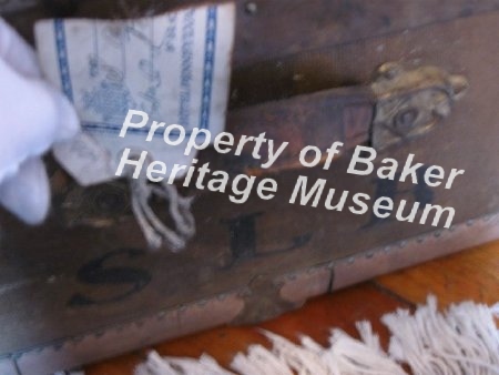 Brown painted canvas trunk with wood beams, brass metal hardware and edges. There are decorated leather straps and handle supports, brass tacks hold supports together. The back has the continuation of the straps as well as metal hinges for the lid. On the right face of the trunk are black painted lettering that reads: "S.L.B. (Suzzie L. Bear?). There is also a tag with white on the backside with blue ink: "S. Adler, Bake, Or". A string attaches the tag to the side handles. The other side has a blue boarder and or the right edge: "#SP1608 25 1222" (in pencil) top left corner "Collect" (cursive), a seal of a capital H and a capital P intertwined inside, continues "To__S.A., Baker. Ore, Fe (rest missing), Fro..(missing), Hotel Pennsylva..(missing)". There is a lock hinge on the base of the trunk that reads: "Yale & Towne MFG Co., Stamford Conn, USA, Y & T (clover)". Inside the trunk is lined with a green fabric, dotted in circular patters. There is a pull—out shelf with a top covering that hinges to the back ,snaps in the front to secure and folds over in thirds. The shelf is comprised of three divisions; one small, one medium, and one large. The bottom section has two wooden rails on the sides to hold the shelf in place. The front of the shelf angles up to allow the trunk to close. The bottom section of the trunk is two compartments.
