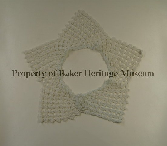 Cream star—shaped with five triangular segments of crochet cotton lace trim. The center opening is 3.5" in diameter. Looks like it may have at one been a collar and was later sewn together.