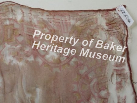 Silk handkerchief with pink, orange and cream geometric shaped pattern both front and back. The outer edge is thicker than the middle. The handkerchief is square.