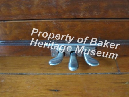 Upright Ludwig & Co. Piano (N.Y.) three peddles constructed out of cherry? wood, has ivory keys and sits on four metal casters. Piano has ornate carved sound boxes and music stand. Locking key guard, bottom sound box opens for extra storage, but latch is very loose.