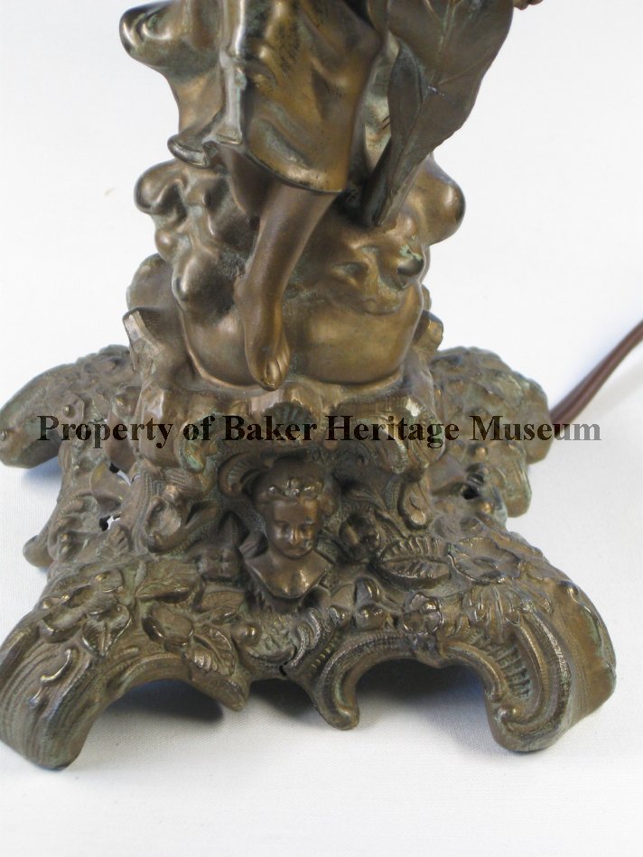 Bronze electric lamp with three lights. Lamp base consists of four feet each detailed with floral designs as well as a bust of a child, same on all four sides. The base is composed of a classical rock formation with three flower stems growing upward and curving over each other. Each stem ends in flower—like vegetation and a frosted candle shaped bulb (bulb doesn't look original to lamp, may have had a different looking bulb that flowed better with the fixture elements) Between the stems is a barefoot woman waring a sarong, her hair tied in a bun. Cord has a hand on and off switch and a brown card reads: Leviton 5A—250V.