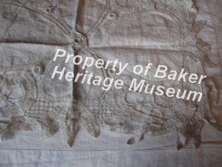 A more or less tatted rectangle lace edged doily. The doily has organic loops and ties in lace (almost sea—like) attached to two small petal—shaped linen section and two large linen sections. The linen is contured by a lace circled hold with four similar circles between the oval shapped linen. The doily is hand—sewn.