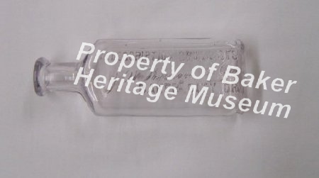 Bottle, apothecary, clear glass with light tint of lavender, rectangular body with narrow neck. Missing stopper. Front reads "prescription druggists, J.W. Wisdom & Co., Baker City, OR." No marks on bottom. Mold line down both sides. On front just below neck is numeral "4".