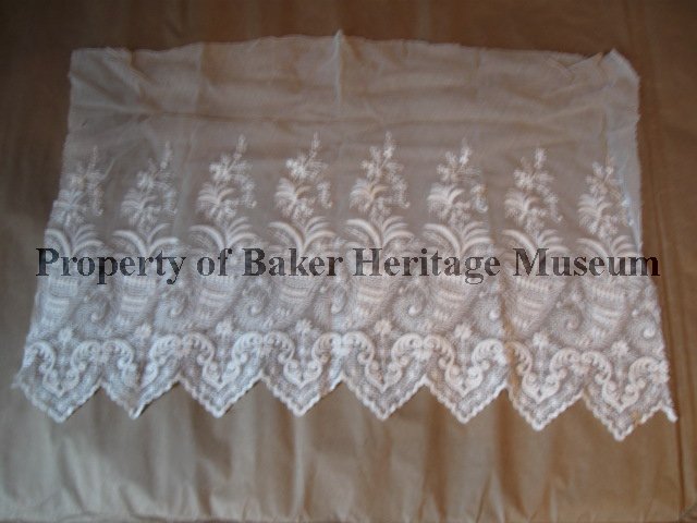 White Lace Fragment's bottom is edged with triangles consisting of flowers, scrolls and cornucopias filled with plants. The plants appear to be ferns, flowers and foliage. The lace is embroidered onto a light tooling fabric.