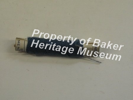Light—blue wool mending thread wrapped around an off—white roll of paper. The paper is a rolled up ad with blue lettering, reading: Chadwick's Fine Grist, English mending wool... the rest is under the yarn and inside the paper's curl and is not readable. Two of the five sewing needles can be found in this mending thread.