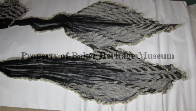 Collar; black chiffon with cream lace and ribbon trim; collar section 8.5" W x 22" L comprised of 2 layers gathered to 1.5" W black satin neck band; collar under layer 6.5" W, black chiffon with 3 horizontal bands of 0.5" W cream lace edged with 0.5" W cream silk ribbon; upper layer 6.75" W black chiffon with 4 horizontal bands of 0.5" W cream lace edged with 0.5" W cream silk ribbon; 2 self—ties are comprised of black chiffon 25" square that are pleated diagonally with tiny pleats and secured to collar band at one corner...creates long diamond shaped tie.