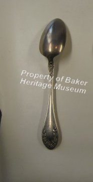 R.Wallace & Sons Rose pattern dessert spoon pat. 1898. At far end of handle are three roses, two rose buds and leaves. Three leaves an open rose and a rosebud on the other end of handle next to spoon's bowl. On the underside of the handle are the underside of the three roses and leaves (no buds) where it joins the bowl part of the spoon there are leaves. Reads: "pat. 1898 (makers mark) RW&S sterling".