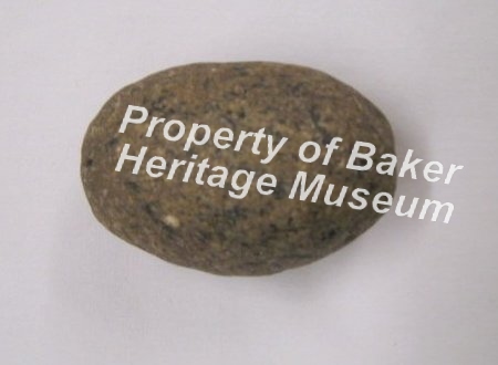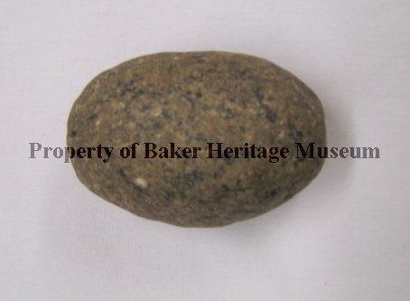 Tomahawk head, stone. Mottled black and tan, rough surface. Groove on one side where it attached to handle.