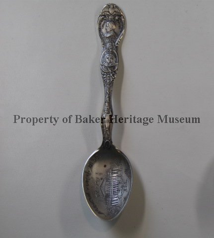 Alaska—Yukon Pacific Expo Souvenir Spoon produced by Silvertown, Joseph Mayer & Bros. pat.#38695. The front of the spoon's handle, being at the far end is an American Bald Eagle, a bust of William H. Seward (with the name around the head and below the words, Father of Alaska). The bust is followed by three evergreen trees, a human head with long hair (curved over the top of the head are the words: The Original Seattle) after which are two flowers, a totem pole and a figure of a man followed by a crossed pick and shovel. The back of the spoon's handle has a shield symbol at the top with a dragon, a Chinese gate, a Chinese scene, three flowers, a rising or setting sun and two ships. The word "Sterling" is stamped followed by the words "Alaska—Yukon Pacific Exposition" in a scroll design. Where the handle joins the bowl of the spoon is the pat. number then a crossed pick and shovel with the letters "MB". The bowl of the spoon's interior says "Agricultural BLD AYP Expo and a depiction of the building. The back of the spoon's bowl says:" Official Souvenir Alaska—Yukon Pacific Expo, Approved: JE Chilberg president, IA McClean? director general."