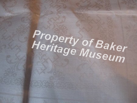 White demask silk napkin with fringe boarder of woven threads. The napkin is very thin almost like parchment. The boarder strip looks like grapes, leaves and vines or pumpkin & bread rolls or tomatoes...(unclear). The center has a six pointed star motif (Star of David?). Inside the square are flowers and geometric patterns that are symmetrical.