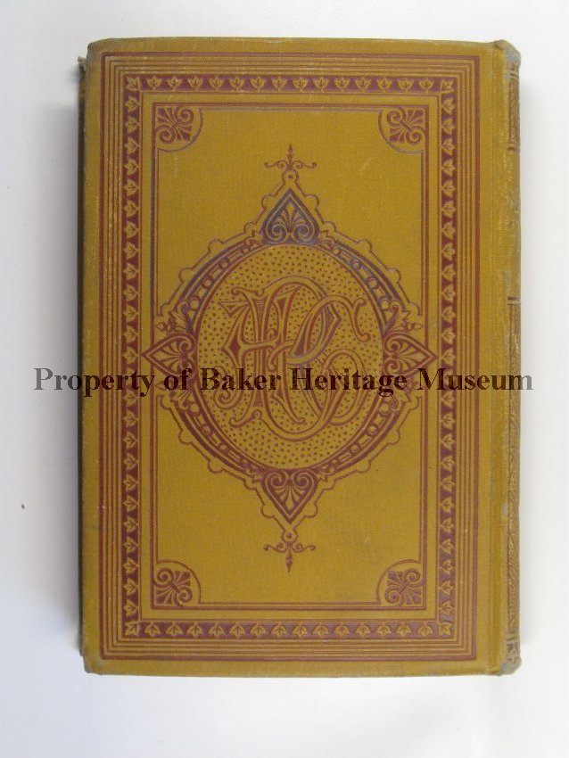 yellow—ocher fabric bound book with red (burnt sienna) embossed flower backdrop with leaf boarder reading:" Barnes's New National Readers, Number 5, American. Book. Company". The edges of the paper are marbled. The spine has the same red embossment with gold letters that read:" New National Readers, —— , Number 5". The back cover is designed with the same leaf motif in red and a large seal with the letters A B C interwoven. The title page reads: "Barnes's New National Readers, New National Fifth Reader, By, Charles J. Barnes, New York, Cincinnati, Chicago, American Book Company." copyright 1884. This is a school book (fifth reader) with illustrations.
