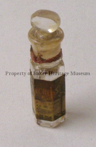 Bottle, glass, with glass stopper. Six sided. Perfume, heart of the flower, rose. There is a two—strand rose colored fine cord around the neck of the bottle.