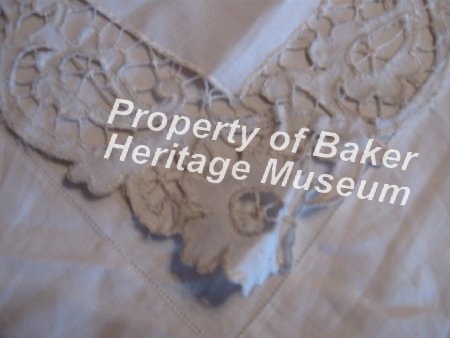 Square linen table scarf with a large 2" open cut linen lace around the edges. The lace has large linen flowers and leaves held together by webbing. The edges are all finished with tread.