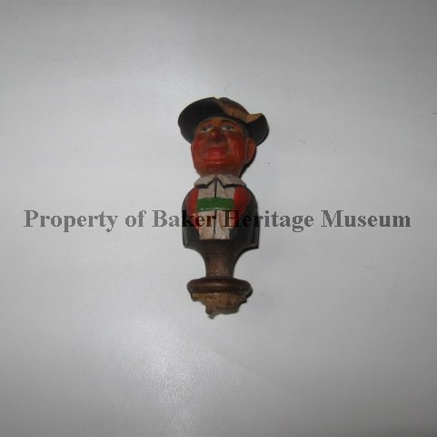 Stopper; bottle; wood carved in shape of head and upper body of a man; black hat with red trim, red cheeks and lips, white shirt, black jacket with red lapels and green band; most of cork stopper missing.