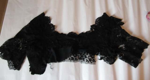 Metal key; flat; tarnished.Lace bodice top and short sleeves from silk blouse or dress; black lace with floral design; remnants of solid black silk that formed the blouse or dress; tattered along lower edge where attached to garment; several snags and holes.