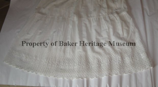 Half—slip; unbleached cotton; 26" waist with 10" long slit opening at one side; fastenes with one hook and eye at waist and two snaps along slit; .5" wide horizontal pleat 12" below waist; 8" below pleat is a slightly gathered 15" band that is bordered at the bottom with 7" wide of eyelet—type decorative edging.