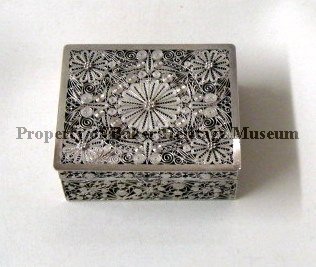 Box, trinket; silver over wood; hinged lid; delicate threads of silver create intricate overall design, including floral motif, dragonflies, and leaves; gift tag inside box of a winter scene, says "Greetings," says "From Velma" in pencil, on the back it says "It took an artist three full days to make this box"; part of the Chengtu (Chengdu) Silver collection which Mamie's niece Merna Putman presented to the museum