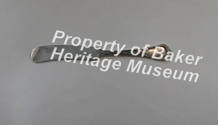 Reed & Barton Modern Art Pattern butter knife. Curved vines wind around the full length of both sides of the handle. The end of the handle has a rounded point. The letter: "A" is engraved at the end of the handle for Adler. The knife lays flat. The back of the handle has a stamp reading: "Reed & Barton, 3, pat. appld for".