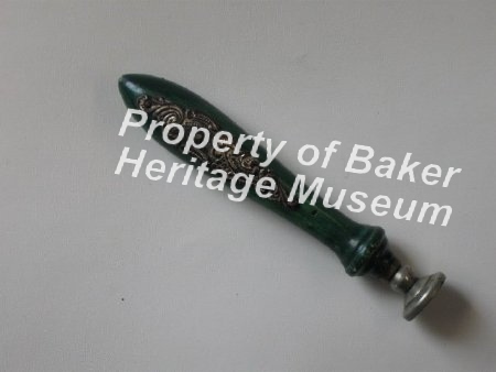 Base of the stamp foot has a backwards P or T etched into the surface. The letter appears to have been hand etched, sections of the etching have slipped. The foot connects to a round bead and the handle is green wood. The handle has a feather pattern sterling silver decorative piece attached to one side, and reads: "Sterling". It is rounded to fit in your hand and is connected to the wood with little nails and looks like the handle of a spoon.