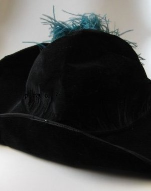 Black velvet hat with a blue—green (turquoise) ostrich feather. The hat has a round top and round brim. The brim has a wire edge and a velvet rosette on the left side where the feather falls to back. The inside of the hat has an adjustable sateen fabric with ribbon. A tag in the hat reads: "3800, rsinu? (on one side) and 1270 in pencil (on the other side)".