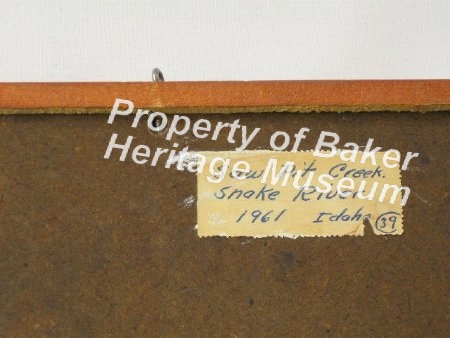 Glass—topped wood—frame case displaying 39 arrowheads collected and mounted by F. Kevin Laughlin. Orange plastic label on front reads, "Hells Canyon Snake R. 1961". Paper label on back reads, "Saw Pit Creek. Snake River 1961 Idaho 39".
