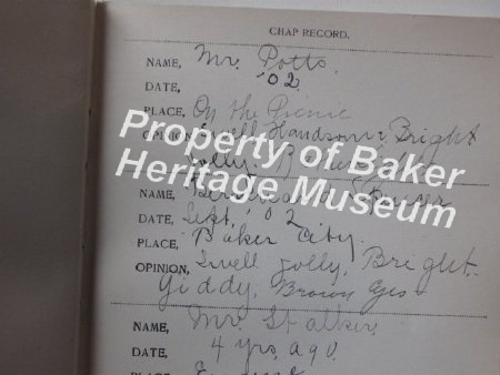 Large brown fabric bound book with black and gold embossed decoration and wording. On the White and green cloth covered book. The Cover has a green embossed image of a man in a suit, hat, gloves & cane appearing to say hello. The spine is green with vertical gold embossed lettering that reads; "Chap Record". The back cover is plain but has the book's light overall texture. Title Page reads: "Chap Record, behold herein all nice and neat a record of the men I meet, among them all perhaps there be, who knows the "not possible" he." as well as an image of the gentleman on the front cover, "Designed by Ada Sproul Reading, New York, Fredrick A. Stokes Co. publishers, no copyright. The book is dissected into 4 categories for recording (Hight, Eye Color, Hobbies, Name....) The back cover has glued newspaper articles of social functions in which Theresa was the guest or attended.