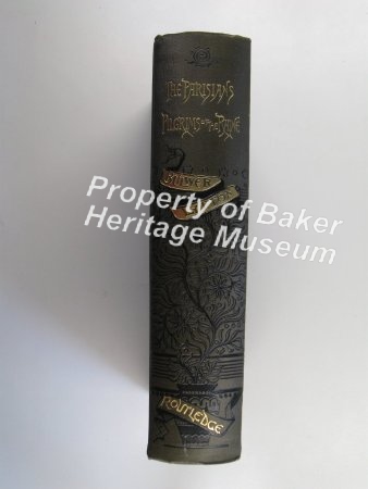 Olive—green fabric bound book with black embossed floral design, scroll and sun motif, wording that reads:" Bulwer Lytton's Novels". This is a set of two stories in a series of 10 books. The spine has the same floral plant scrolled embossment and gold & black lettering, "The Parisians (2 books) & Pilgrims of the Rhine, Bulwer Lytton, Routledge". The back cover is plain. Title pages begin with an illustration and read: "The Parisians & the other story of Pilgrims of the Rhine, By Edward Bulwer Lytton, Lord Lytton, Pub. George Routledge and Sons, London: Broadway Ludgate Hill, New York: 9 Lafayette Place (no copyright date)".