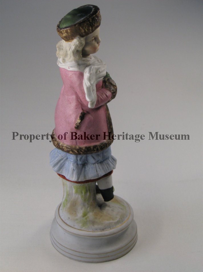 Porcilne statuette of a young Woman in a hat, fur coat, cuff, scarf and boots in a classic pose with a tree stump as support. Cast from a mold, with a green hat & muff a brown fur edging on the hat, coat, coat sleeves, and coat pockets. Burnt orange underdress, yellow tassels on the boots a white scarf with pink triangular dots a pink coat and a blue dress. Reminiscent of Austrian Rococo work?