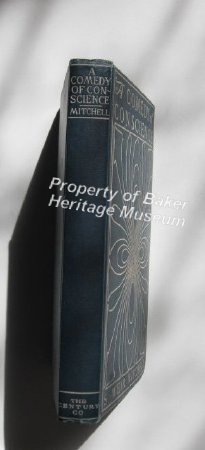 Blue—Green fabric bound book . The front has white embossed lettering and an interwoven cross pattern and reads:" A Comedy Of Conscience, S.Weir Mitchel. The spine reads: "A Comedy Of Conscience, Mitchel, The Century Company". The back cover is plain blue—green. Inside on the cover page in pencil: "Theresa Adler". The title page has a pencil marking on the top right: "1000" There is also an illustration and reads in red ink: "A Comedy of Consiounce, (blk ink) by, S. Weir Mitchel MD. LLD Harvard & Edinburgh" there is also a seal of book with Loral wreaths. New York, The Century Company 1903, copyright 1900, Pub. March 9th 1903 by The Devine Press. The pages of the book have a deckled edge. There is small wording on each page and looks like a child's book.