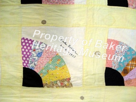 Quilt; cotton; grandmother's fan; twenty—four blocks; 1930s print fabrics with solid black accent and black embroidered names and dates; sashing solid pale yellow; back muslin; binding is muslin back brought to the front; machine pieced; machine quilted in horizontal and vertical lines; batting appears to be two layers of flannel. 22 blocks dated 1937, 1 dated 1938, 1 dated 1941.